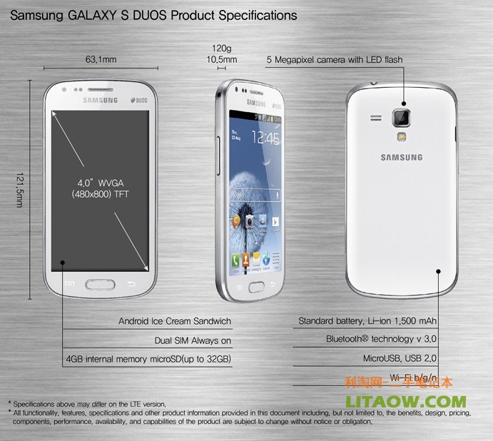 三星集團又推出一款新款智能手機,將首先在歐洲發(fā)布并推出,型號是Galaxy S Duos。這款手機早前就被媒體報告過,現(xiàn)在終于得到了官方的證實并且已經(jīng)在三星的官方網(wǎng)站公布了,配置如下:處理器用的是1GHZ的核心CPU,再配上最高可達32GB的SD內(nèi)存卡,機身自帶4G存儲,攝像頭有500萬像素,屏幕用的是4寸的TFT屏幕,電池容量為1500毫安,3.0的藍牙配備,MICRO USB接口,系統(tǒng)預裝的是安卓4.0系統(tǒng),另外外觀如下圖所示,跟今年三星的主打的旗艦機Galaxy S III幾乎外觀一樣。官方公布的發(fā)售地區(qū),表示將首先在歐洲區(qū)發(fā)售,其它地點有興趣的朋友可以隨時留意三星官網(wǎng)信息。