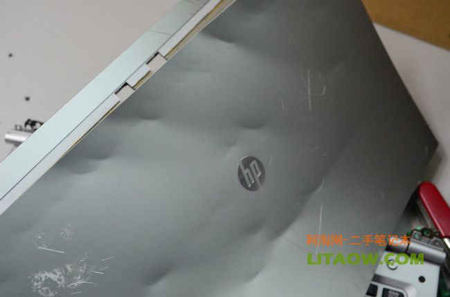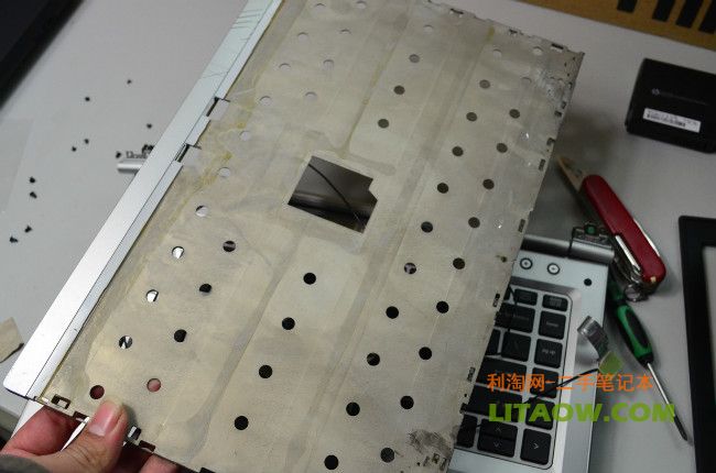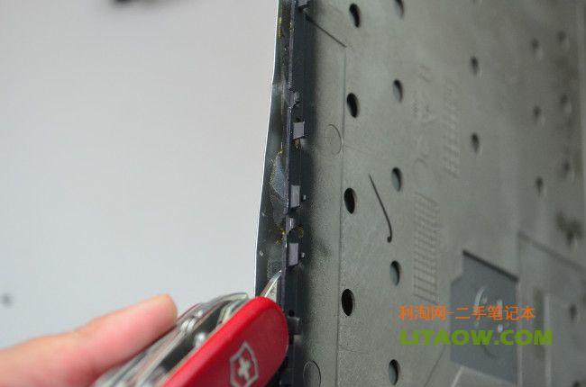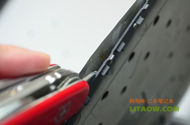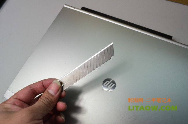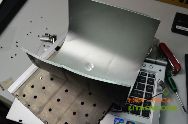 拿來(lái)一個(gè)瑞士軍刀,從邊角的地方開(kāi)始撬開(kāi),惠普在出廠的時(shí)候?qū)蓚€(gè)金屬外殼先做好然后使用強(qiáng)力橡膠貼合在一起,用軍刀都很難將其分離,最后我們連錘子都用上了!