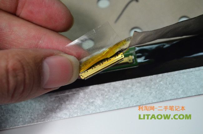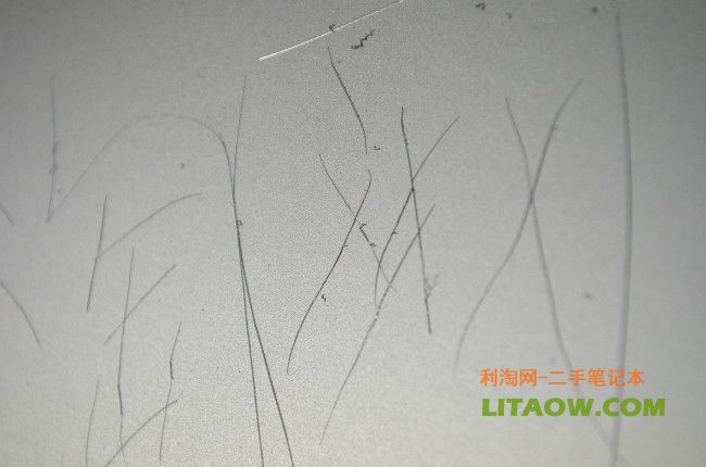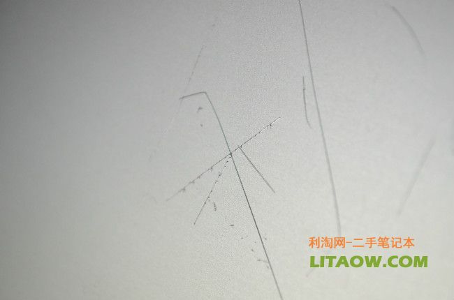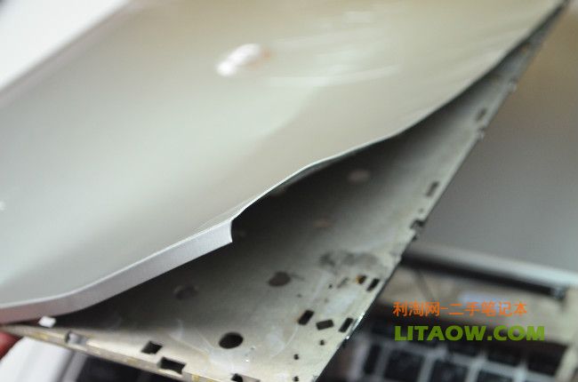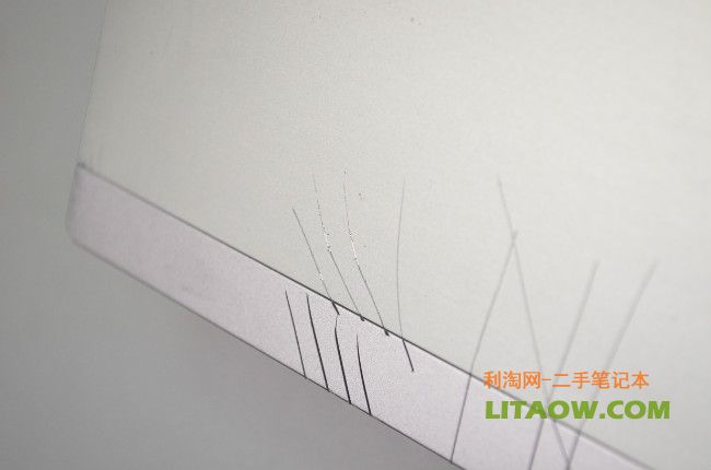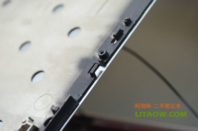 很明顯已經(jīng)可以看到了金屬面的反光,不論是Thinkpad還是HP的機(jī)型筆記本電腦的無(wú)線(xiàn)以及3G預(yù)留的天線(xiàn)位置都隱藏在屏幕外殼上,因此為了增強(qiáng)信號(hào)不被金屬屏蔽,Thinkpad的做法就是在外殼最上面有一塊塑料來(lái)代替金屬,而HP從NC6400開(kāi)始到后來(lái)的6930P.8440P,8460P都沿用了最開(kāi)始的設(shè)計(jì),那就是將最上面的一個(gè)橫條使用塑料材質(zhì)然后里面放置隱藏的天線(xiàn)位置,下圖中我們可以看到刀片劃過(guò)之后金屬的和塑料還是有一定的差別!