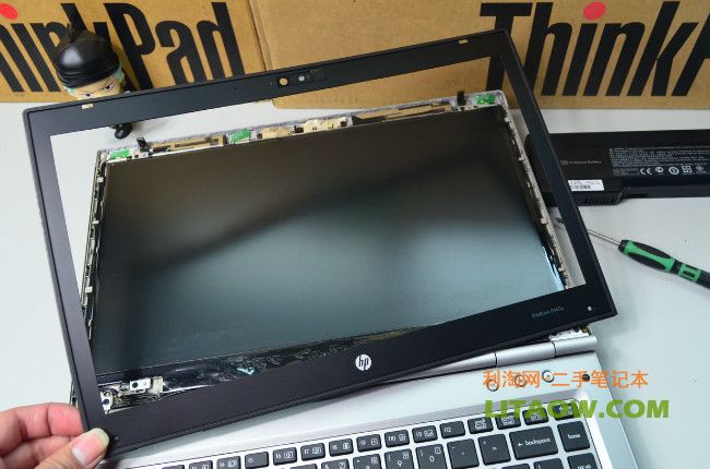 二手8460P只有兩顆螺絲來(lái)固定屏幕的框,下圖中左右兩個(gè)位置