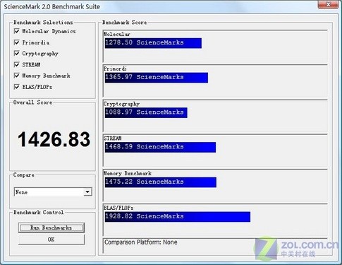 PCMark Vantage Pro測(cè)試結(jié)果(點(diǎn)擊放大) 通過結(jié)果可以看出除了“TV and Movie”得分不高外,其余測(cè)試均得到了很高的分?jǐn)?shù),整體性能很平衡。再來(lái)看一下ScienceMark的整機(jī)測(cè)試結(jié)果: