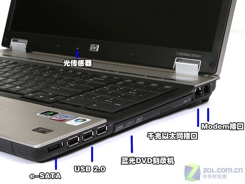 左側(cè)接口 8730w右側(cè)提供了一個(gè)升級(jí)托架,可以升級(jí)第二塊硬盤,為原硬盤提供數(shù)據(jù)保護(hù),或組建RAID 0陣列提升磁盤讀寫能力。升級(jí)托架也可以安裝光驅(qū)。這款送測(cè)的8730w配置了一臺(tái)藍(lán)光R/RE DVD+/-RW SuperMulti DL光驅(qū),可以創(chuàng)建、錄制、重寫和回放高清視頻。在屏幕的中下方位置提供了一個(gè)光傳感器,屏幕可以根據(jù)環(huán)境光線自動(dòng)調(diào)節(jié)亮度,非常便捷。