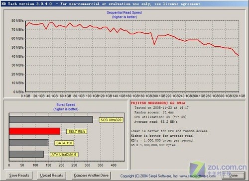ScienceMark內(nèi)存帶寬測(cè)試(點(diǎn)擊放大) 3、磁盤性能測(cè)試 磁盤平均讀取速率為65.2MB/s,隨機(jī)訪問時(shí)間15.4ms,突發(fā)傳輸速率195.7MB/s,磁盤最外圈速率不到80MB。從數(shù)據(jù)來(lái)看雖然硬盤轉(zhuǎn)速達(dá)到了7200轉(zhuǎn),但是相對(duì)于臺(tái)式硬盤還稍有差距。從讀取曲線來(lái)看還是比較平穩(wěn),數(shù)據(jù)傳輸比較穩(wěn)定。