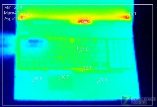 測(cè)試結(jié)果 SPECapc for SolidWorks 2007測(cè)試中,惠普8730w工作站I/O得分1.99,CPU得分2.66,顯卡得分2.48,總分2.49。 通過上面的專業(yè)測(cè)試以及和參考系統(tǒng)的比較結(jié)果可以看出,惠普8730w移動(dòng)工作站在專業(yè)應(yīng)用方面表現(xiàn)出了強(qiáng)大的性能,并沒有因?yàn)橥庑蔚南拗贫鵂奚阅堋?nbsp; 7、熱量測(cè)試 熱量測(cè)試采用專業(yè)的FLUKE Ti20 熱像儀,并且在進(jìn)行SPEC測(cè)試之后進(jìn)行熱量測(cè)試,比較符合真實(shí)的應(yīng)用情況,室溫22攝氏度左右。從熱象圖可以看到在經(jīng)過高負(fù)荷運(yùn)行后,惠普8730w最高溫度在42設(shè)置度左右,鍵盤、掌托等接觸部分溫度并不高,不會(huì)讓人產(chǎn)生不適。