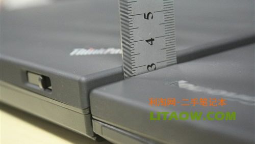 將T400S和T400都盒蓋后能看到兩款筆記本電腦的厚度差別,但是你要注意一個細節(jié),那就是墊腳的高度T400S明顯高很多,也就是說厚度上T400S遠本普通的T400要薄一些