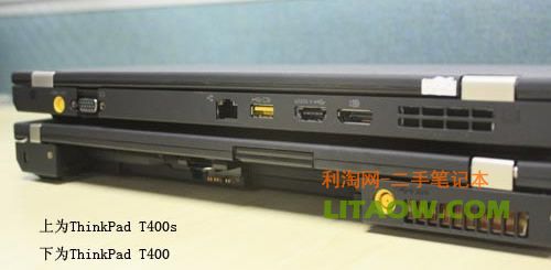 明顯可以看出來上面的T400S設(shè)計上更為輕薄,下面的為普通的二手thinkpad T400,右邊的設(shè)計有點差別,那就是T400S上面多了一個無線開關(guān)位置,其實將T400原來的硬盤位置改變了,以及T400右邊有備用的USB接口,而T400S上已經(jīng)變成了貓的接口