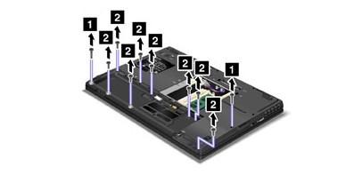 首先將內(nèi)置的電池拔掉以及電源關(guān)閉,然后看到下圖中的螺絲,所有標(biāo)注號(hào)碼一樣的都是一樣長(zhǎng)度的螺絲,因此一定要注意這里的長(zhǎng)度,如果高于原來的設(shè)計(jì)就容易將筆記本擰穿破壞掉外殼了。