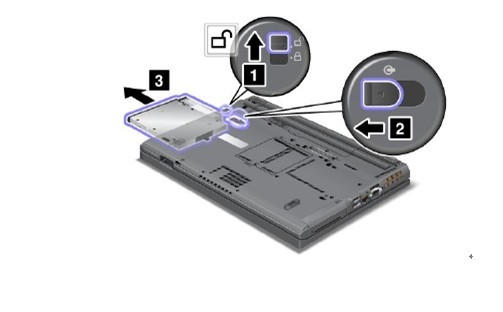 下圖中我們首先將筆記本的電池和電源都拔掉(其實(shí)筆者很少這樣做,如果要換的話關(guān)機(jī)都沒有關(guān)就直接開始操作了,但是聯(lián)想在技術(shù)手冊(cè)上強(qiáng)烈建議大家關(guān)閉計(jì)算機(jī)的電源拔掉電池再操作) 下圖中有分別幾個(gè)阿拉伯?dāng)?shù)字教你第一步先打卡鎖,然后第二部就是推出光驅(qū)就可以了,第三部不用說(shuō)了用手拿著出來(lái)的光驅(qū)。