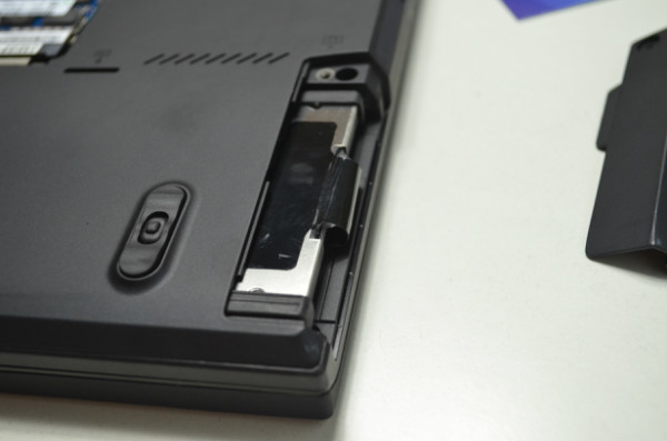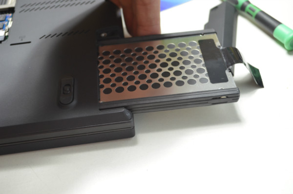 硬盤和原來(lái)的位置是一樣的也是非常簡(jiǎn)單,側(cè)面的塑料片是用來(lái)固定硬盤的一共只有一個(gè)螺絲固定,擰開之后硬盤的支架上有一個(gè)黑色的塑料片把手可以拔出硬盤,如果要自行更換的話還需要將硬盤上的兩邊橡膠片取出然后固定的金屬支架一共四顆螺絲也全部擰下來(lái),更換新的硬盤安裝在網(wǎng)架上就可以了,這款T430S支持的硬盤只有2.5寸7毫米超薄的那種硬盤,如果自己升級(jí)的話千萬(wàn)不要弄錯(cuò)了即可。