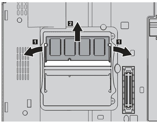 可以看到內(nèi)存的位置預留的是右邊空缺是用來給用戶以后X200升級使用,先按照箭頭1將內(nèi)存撥開然后取出內(nèi)存即可