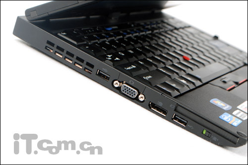 在機身左側(cè),ThinkPad X220 Tablet為用戶提供了一個USB2.0接口、VGA接口、HDMI接口、1個USB2.0接口、無線控制開關(guān)鍵以及Display 接口。
