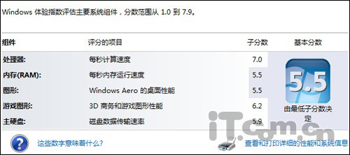 在Windows的自測成績中,我們看到雖然最低分出現(xiàn)在的是圖形以及內(nèi)存方面,但是5.5分的成績已經(jīng)不俗了,比一些入門級的獨顯的分數(shù)還要高。對于滿足日常影音及娛樂的需求應(yīng)付起來還是綽綽有余的。
