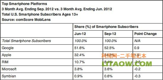 全球性互聯(lián)網(wǎng)信息服務(wù)提供商ComScore發(fā)布最新全球手機系統(tǒng)平臺占有率,其中上升幅度最大的是蘋果的iOS系統(tǒng)。ComScore是在最近一個季度間遍訪了美國超過3萬名智能手機使用的用戶,以此來為基準(zhǔn)分析得出現(xiàn)在全球市場手機的市占有率,其中在智能手機平臺占有率方面,谷歌依然勞勞的把持住手機系統(tǒng)市場上的龍頭老大位置,市占有率高達(dá)百分之五十二點五,超過一半的占有率,但上升幅度最大的還算是蘋果的IOS系統(tǒng),上升了百分之二左右,以百分之三十四點三的市場占有率位居第二位,其它依次是黑莓系統(tǒng),微軟的windows系統(tǒng)還諾基亞的塞班系統(tǒng)。其中降幅最多的是黑莓系統(tǒng)??磥砉雀韬吞O果已經(jīng)不是其它系統(tǒng)能陰檔的了的了。