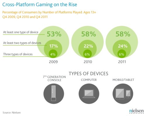 米國的一個調(diào)查公司Neilsen 近期發(fā)布了一個關于本國游戲使用的一個報告,也就是說玩游戲在每個美國人的生活中占據(jù)了一個不錯的覺得。相對去年來說美國人每天花費在游戲上的時間增加了大約是 7%(估計是蘋果ipad游戲機以及一些平板電腦的功勞);現(xiàn)在還有一些Wii、Xbox 360、PlayStation 3 等次世代游戲主機的擁有率也從 50%上升到了 56%;越來的用戶喜歡上平時上班路中玩游戲來打發(fā)時間,24%的被調(diào)查者表示自己至少在 2 個平臺(主機、PC、平板或是移動設備)上玩過游戲,但是去年的這個調(diào)查只有 17%;單獨在移動設備方面,iOS 在各個年齡段都有類似數(shù)量的用戶,不過安卓平臺的客戶大約都是一些24-34歲之間的用戶使用。