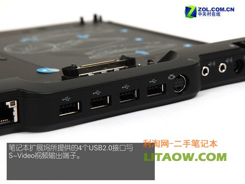 除此之外,擴展塢還擁有多達4個USB 2.0接口、S-Video視頻輸出端子、音頻輸入輸出接口與電腦鎖。當然,更讓我激動的是其在左側還具備有一個1cm厚的DVD刻錄機,這對非全內置設計的2730p來說非常重要。