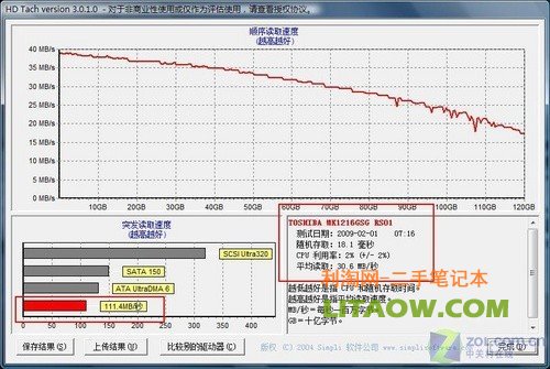 根據(jù)HD Tach軟件測試結果看,111.4MB/秒的突發(fā)傳輸率與30.6MB/秒的持續(xù)傳輸率只能相當于上一代2.5英寸SerialATA硬盤。但是極平緩的順序讀取曲線卻表明了這塊硬盤能夠在任何時候都表現(xiàn)出均衡的讀寫性能,而這也是保證日常使用的關鍵。