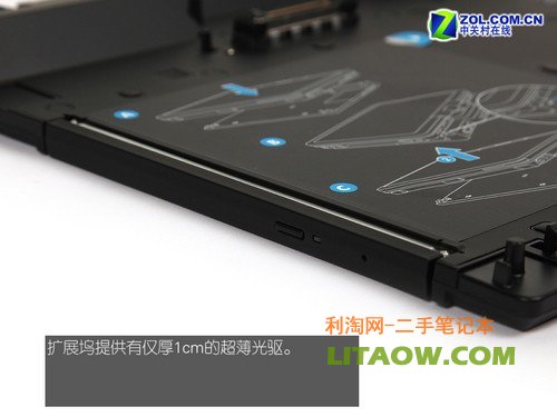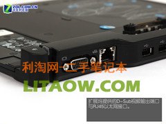 該擴展塢將接口放置在了其后側,而一個僅厚1cm的超薄光驅則被一同放置在了擴展塢中。從擴展塢后方,我們可以看到其提供了1個D-Sub視頻輸出接口(原機D-Sub接口會因擴展塢的接駁而被擋?。┡cRJ45以太網接口。