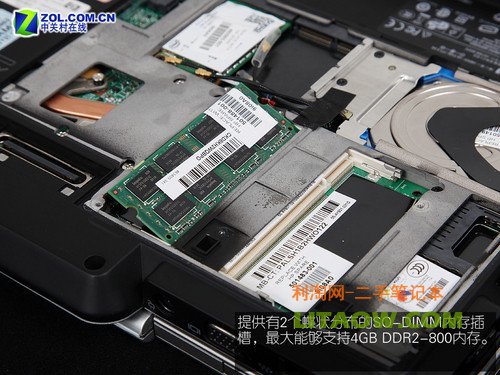 通過拆解可以發(fā)現(xiàn),2730p具備有2個SO-DIMM內存插槽,其最大能夠支持4GB-DDR2 800內存。內存排布以蝶狀形式分布,這不但降低了整機的厚度也更進一步解決了內存運行時相互之間的電磁干擾。