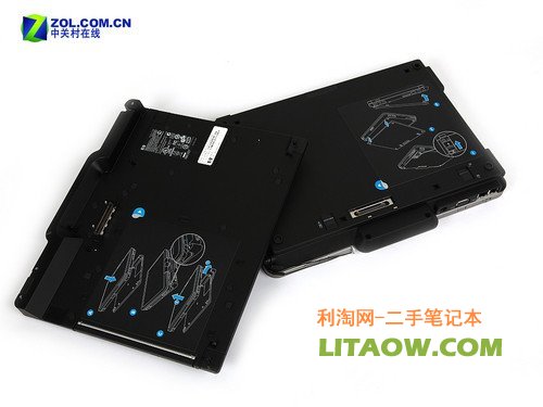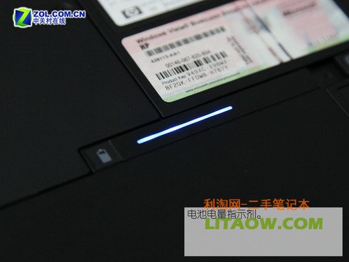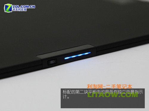 實際上在2730p筆記本的機體底部已經預留有相應的擴展塢接口與旅行電池插口。比較有趣的是,因為所提供的是平板電池,所以在完全安裝后電池會覆蓋筆記本的整個底座?;萜找矝]有忘記為這塊額外提供的旅行電池設計一個電量指示劑。