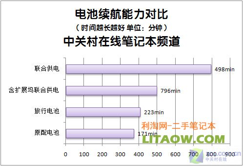 旅行電池擁有10.8V 4259mAh 46Wh的性能參數(shù),并且其能夠單獨為筆記本供電(不含原配筆記本電池)也可以與原配電池聯(lián)合供電。針對兩塊電池續(xù)航能力效果我選擇了4種搭配狀態(tài):1、僅原配電池供電;2、僅旅行電池供電;3、聯(lián)合供電;4、含擴展塢續(xù)航效果。測試以Windows Vista Business為平臺采用BatteryMark中的Life Test模式進行。