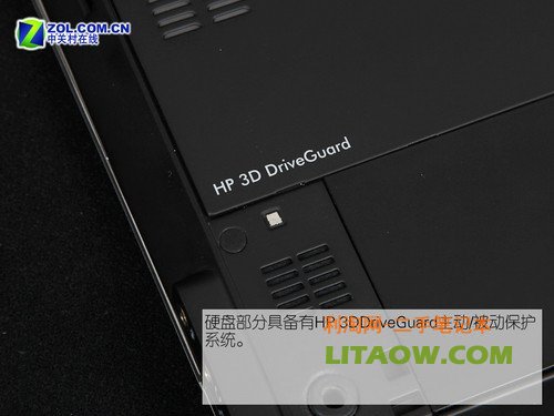 看到機體底部“HP 3D DriveGuard”的標識了嗎?這代表2730p具備有主動、被動兩種硬盤抗震模式。所謂被動抗震即是在硬盤周圍的那圈藍色減震橡膠,而主動抗震則是內置于筆記本中的重力感應芯片,用戶可以通過“HP 3D DriveGuard System”來進行相應的設置。