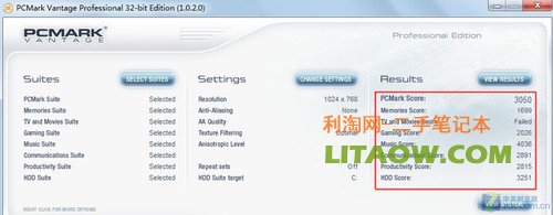 在以上單項(xiàng)測(cè)試后,我們對(duì)處理器、硬盤(pán)的性能有了一定程度的了解,隨后進(jìn)行的是PCMARK VANTAGE跑分測(cè)試,它可以評(píng)估筆記本在實(shí)際應(yīng)用中的表現(xiàn),譬如高清視頻播放、游戲、音樂(lè)、生產(chǎn)力、通信以及內(nèi)存、硬盤(pán)性能,聯(lián)想U(xiǎn)260在測(cè)試過(guò)程中總成績(jī)?yōu)?050分,其中音樂(lè)和硬盤(pán)較為突出。