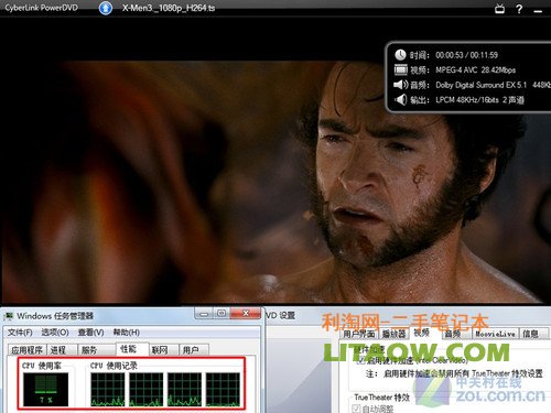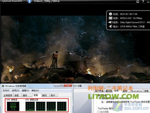 打開(kāi)Power DVD播放軟件,首先進(jìn)入視頻界面,啟用硬件加速功能,通過(guò)Intel Clear Video技術(shù),實(shí)現(xiàn)完全硬解MPEG2、VC-1以及H.264這些主流編碼格式的高清影片,可以看到在視頻播放過(guò)程中處理器占用率是很低的,也就是說(shuō)還有很大余量去處理其它的事情。
