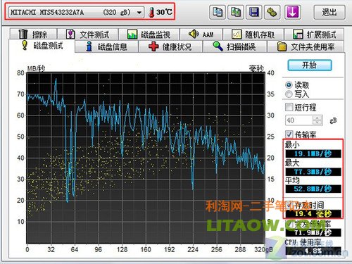 聯(lián)想U(xiǎn)260配備了一塊日立320GB筆記本硬盤(pán),經(jīng)過(guò)HD Tune測(cè)試,其最大讀取速率為77.3MB/s,平均速率為52.8MB/s,存取響應(yīng)時(shí)間為19.4ms,在5400轉(zhuǎn)同類(lèi)硬盤(pán)中表現(xiàn)中規(guī)中矩。