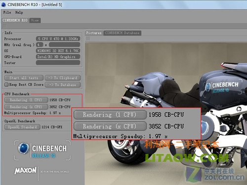 CINEBENCH R10處理器渲染測(cè)試過(guò)程中,單核心處理速度并不算快,成績(jī)?yōu)?958 CB-CPU,雙核心四線(xiàn)程速度明顯加快,成績(jī)?yōu)?852 CB-CPU。