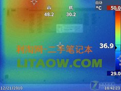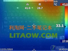 播放完高清視頻,接著運(yùn)行PCMark Vantage一小時(shí),然后使用FLUKE Ti25熱成像儀觀察其表面溫度,特別是機(jī)身C面鍵盤(pán)與腕托區(qū)域,我們看到聯(lián)想U(xiǎn)260機(jī)身C面整體溫度表現(xiàn)良好,除鍵盤(pán)右側(cè)靠近轉(zhuǎn)軸部分區(qū)域溫度稍高外,皮質(zhì)腕托處表現(xiàn)比較出色,讓熱量遠(yuǎn)離手部的做法是我們希望看到的。