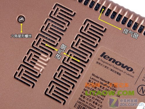由于使用了內(nèi)置電池,機(jī)身底部比較平坦,僅設(shè)計(jì)有我們熟悉的古典風(fēng)格散熱窗,空氣由底部進(jìn)入機(jī)身,內(nèi)部循環(huán)后由后端的排氣窗出來(lái),另外六角螺絲比較特別,這種型號(hào)的螺絲在筆記本上比較少見(jiàn),由于沒(méi)有硬件擴(kuò)展倉(cāng),因此日后想要升級(jí)配置或清理風(fēng)扇并不輕松。