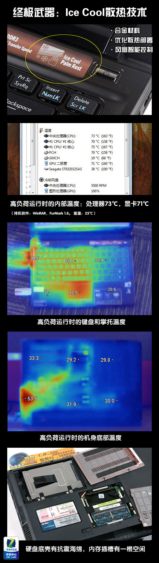 一款筆記本,無(wú)論性能有多好、續(xù)航時(shí)間有多長(zhǎng),如果散熱效果不好也是無(wú)法令人滿意的。在華碩UL80Jt的機(jī)身貼標(biāo)中,我們看到“Ice Cool Palm Rest”(清涼掌托)的字樣,看來(lái)它對(duì)自己的散熱效果還是有信心的。下面我們就通過(guò)實(shí)際測(cè)試,來(lái)看看它的內(nèi)部和表面溫度究竟如何?