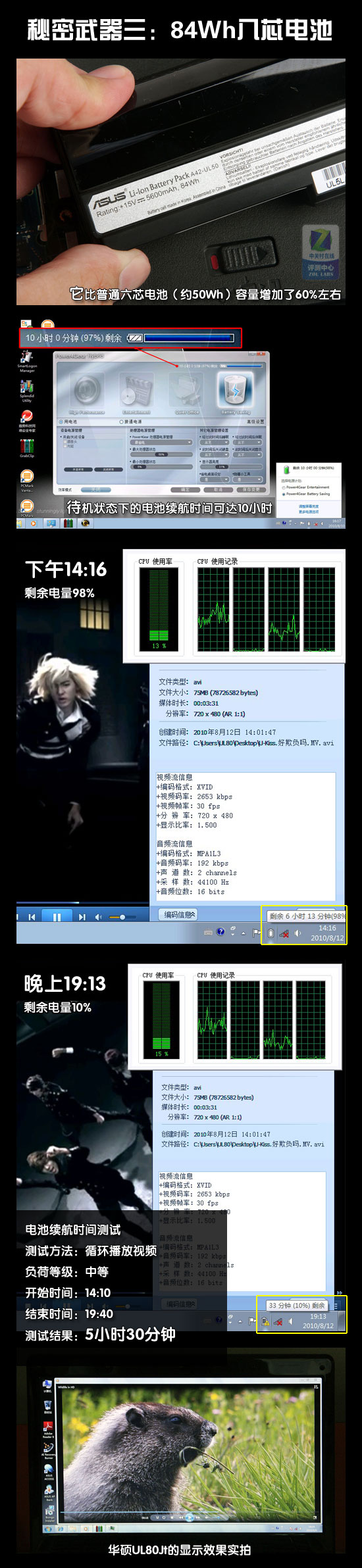 那么,當(dāng)超省電的處理器和顯卡配上大容量電池后,UL80Jt可以持續(xù)工作多長(zhǎng)時(shí)間呢?在下面的截圖中,我們看到這款本本在低負(fù)荷的待機(jī)狀態(tài)下可以續(xù)航10小時(shí)左右,但很明顯這個(gè)數(shù)據(jù)并沒(méi)有太大意義,我們想知道的是筆記本在不間斷的正常使用下,實(shí)際能工作多少小時(shí)?