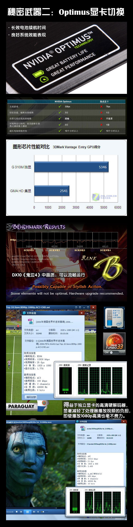 從上面的測(cè)試成績(jī)來(lái)看,G 310M獨(dú)顯的性能大約是集顯的兩倍左右,玩普通游戲、看高清電影都沒(méi)有任何問(wèn)題。如果說(shuō)Turbo33解決了CPU方面的性能瓶頸,那么Optimus就解決了顯卡方面的性能瓶頸,同時(shí)在電池續(xù)航時(shí)間方面也沒(méi)有任何妥協(xié)。