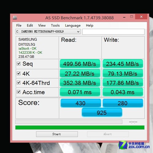 一般固態(tài)我們都使用了AS SSD測(cè)試中,配備的三星 256GB SSD 固態(tài)硬盤的讀寫(xiě)速度分別達(dá)到讀取 499.56 MB/秒和寫(xiě)入 234.45 MB/秒的成績(jī),而 4K 隨機(jī)讀取速度達(dá)到了 27.22 MB/秒,整體表現(xiàn)相當(dāng)出色。