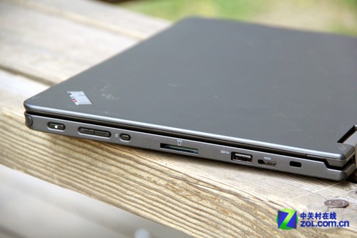 在我們分別可以看到這款筆記本的右側(cè)接口是: 一個(gè)電磁筆位置(如果沒(méi)有支持電磁筆的一般這里空置以后可以升級(jí)的槽或者一個(gè)塑料模塊直接封死), 電源口, 音量的加減按鈕, 屏幕翻轉(zhuǎn)鎖死按鈕, 多功能讀卡器,以及一個(gè)USB3.0口, 還有一個(gè)Mini HDMI口, 以及一個(gè)鎖孔。