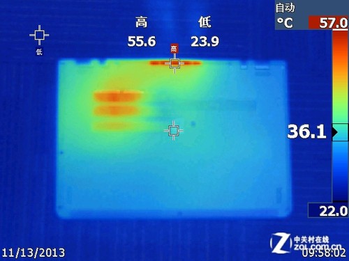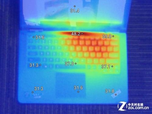 如很多人問(wèn)一款筆記本散熱好壞取決于什么?筆記本通過(guò)散熱管來(lái)導(dǎo)熱到風(fēng)扇上面,一般好的筆記本電腦最高的溫度都基本是集中在散熱管出風(fēng)口位置,如果連計(jì)算機(jī)的高溫不能通過(guò)散熱系統(tǒng)帶到風(fēng)扇出風(fēng)口的話那么說(shuō)明這款筆記本的散熱做的不夠優(yōu)秀,從S1 的熱成像可以明顯看到散熱口的溫度出風(fēng)口是最高的,綜合來(lái)說(shuō)在超極本和平板二合一系列筆記本中S1 散熱做的還是比較優(yōu)秀的。