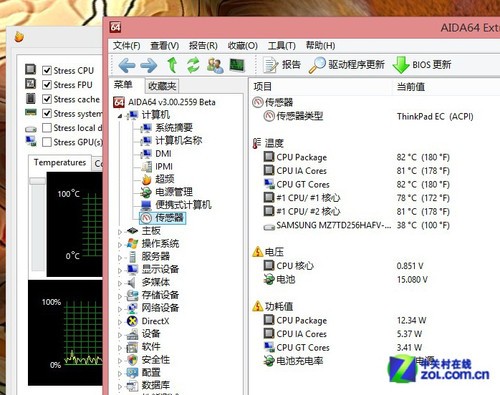 從軟件中我們可以更直觀的看到,滿負(fù)荷下的處理器以及顯卡的溫度,處理器的溫度上升至82℃,而核心顯卡的溫度也在80℃左右。這個(gè)溫度相對(duì)超極本來(lái)說(shuō)超薄的筆記本發(fā)熱都略微有點(diǎn)高正常。