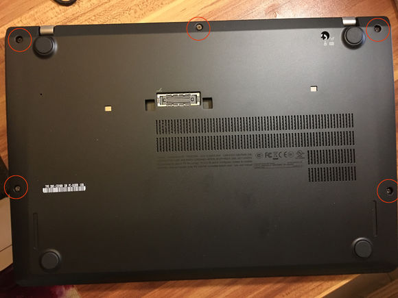 如下圖中,將這臺二手T470S筆記本的底蓋螺絲全部擰開, 紅圈位置的螺絲就是固定底蓋的,底蓋材質(zhì)是金屬鋁鎂合金材質(zhì),